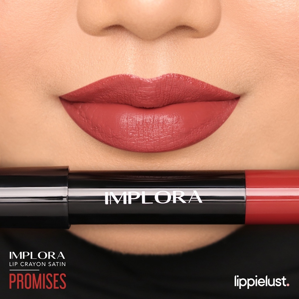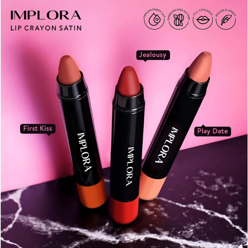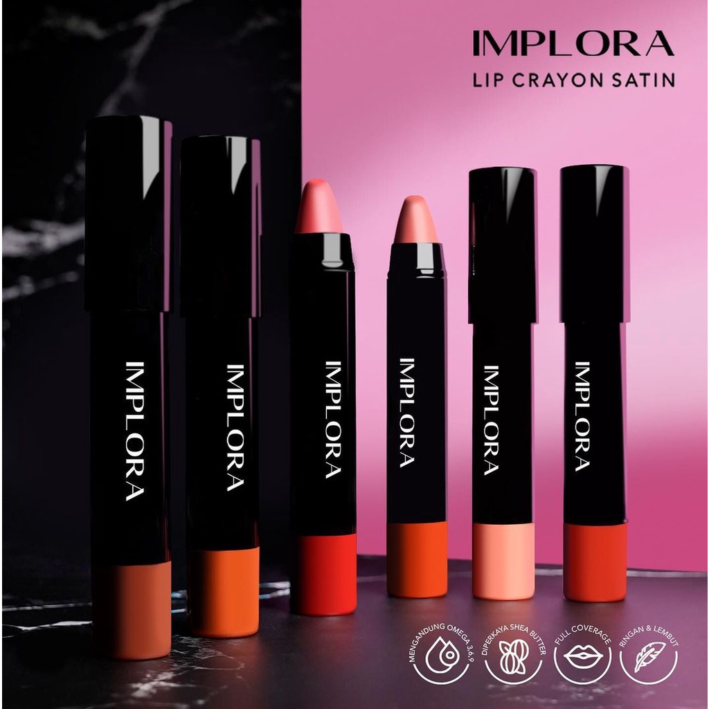 Implora Lip Crayon Satin dengan formula yang mengandung berbagai omega 3,6,9 dan Shea Butter yang berfungsi membantu menjaga kelembaban alami bibir hingga tampak memukau dan memberikan hasil akhir warna creamy / satin pada bibir serta tahan lama. Dengan ujung lip crayon yang mudah diaplikasikan ke bibir.