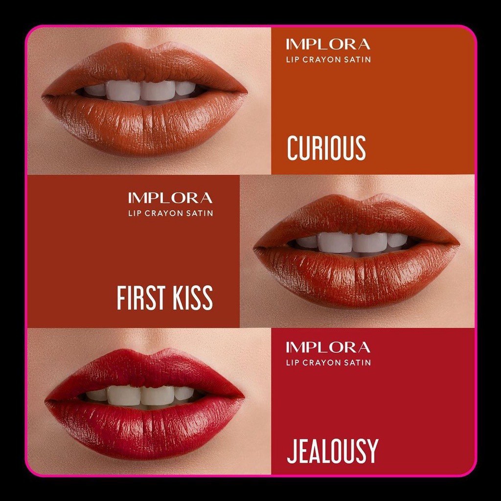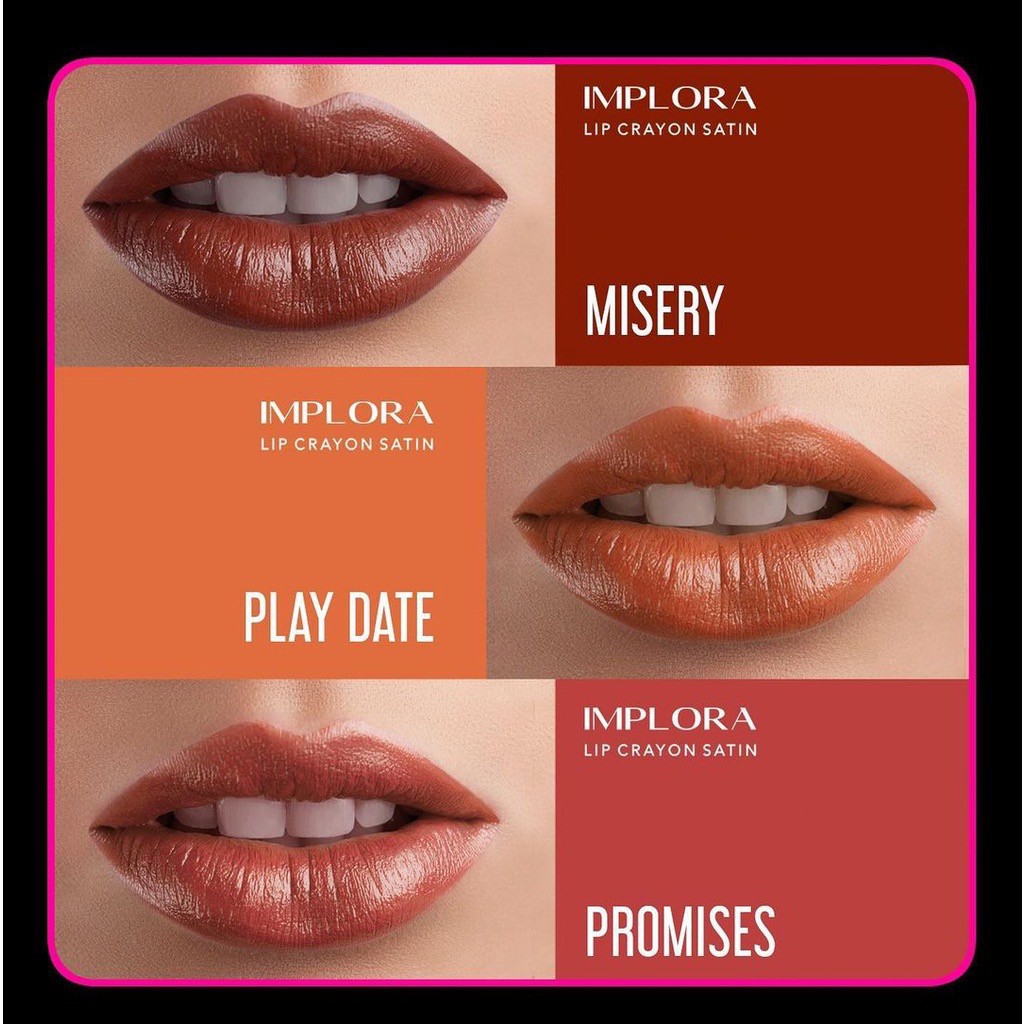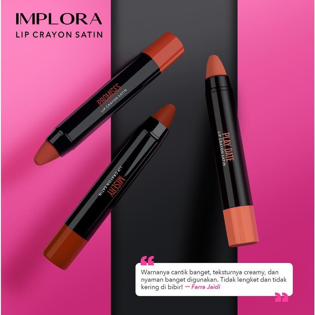 Implora Lip Crayon Satin dengan formula yang mengandung berbagai omega 3,6,9 dan Shea Butter yang berfungsi membantu menjaga kelembaban alami bibir hingga tampak memukau dan memberikan hasil akhir warna creamy / satin pada bibir serta tahan lama. Dengan ujung lip crayon yang mudah diaplikasikan ke bibir.